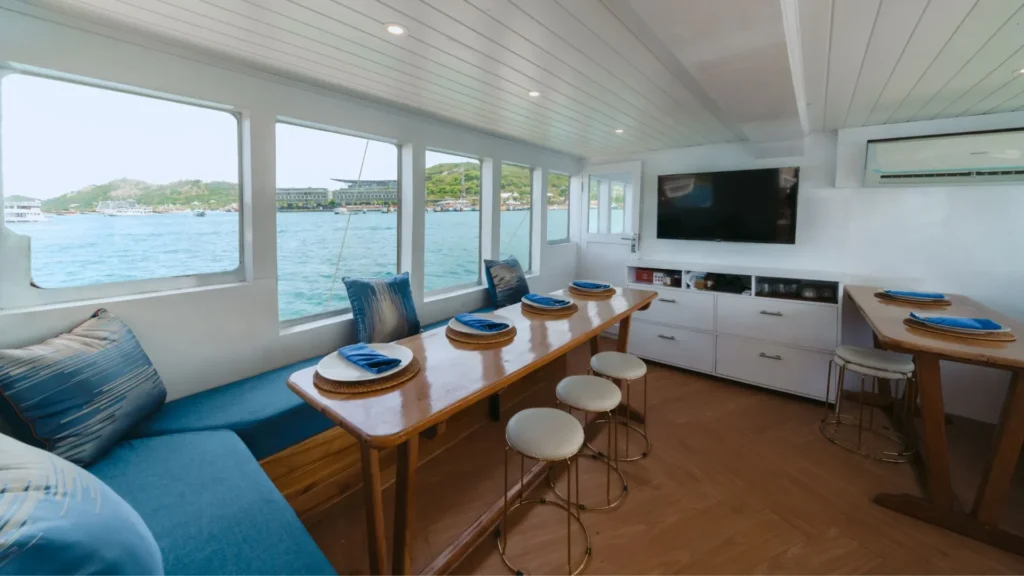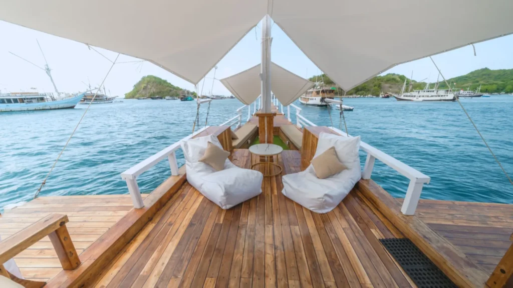 Mega Trusmi, kapal phinisi deluxe berkapasitas hingga 11 tamu, dirancang untuk kenyamanan maksimal selama sailing trip di Labuan Bajo.